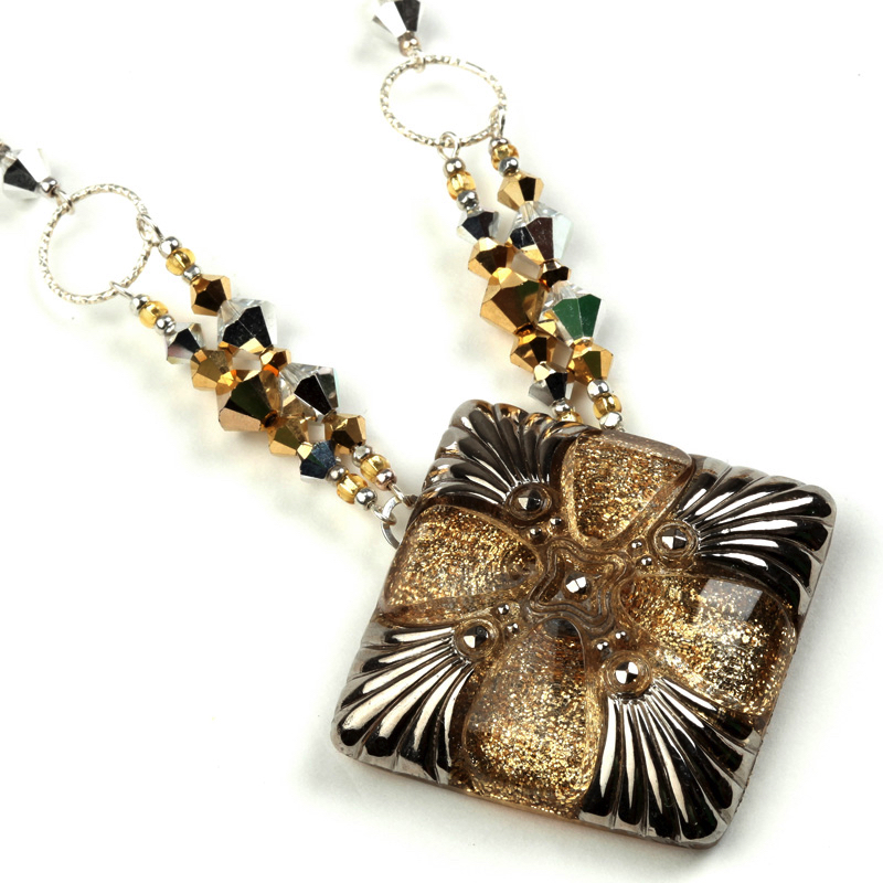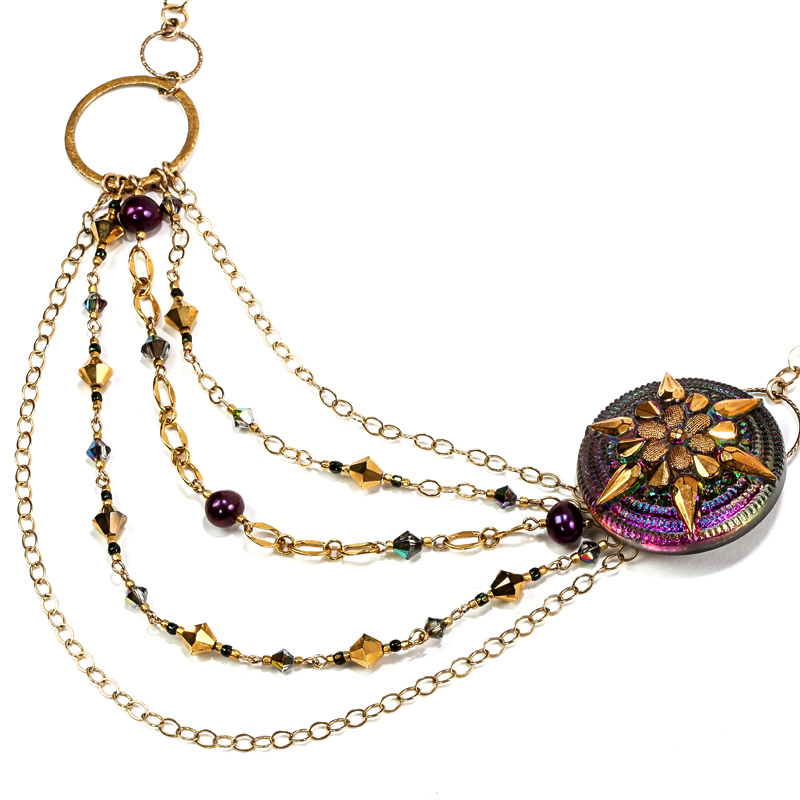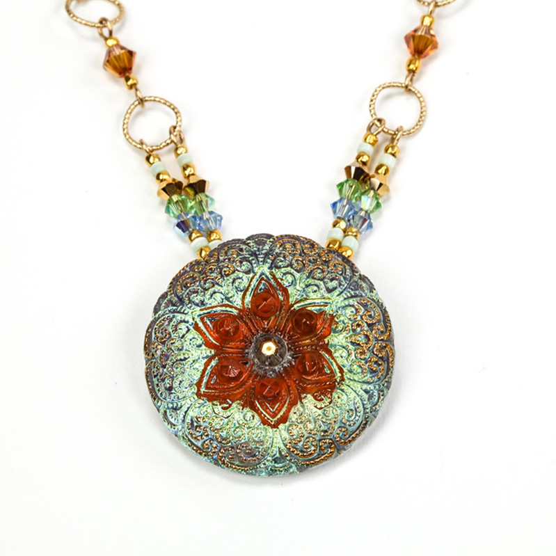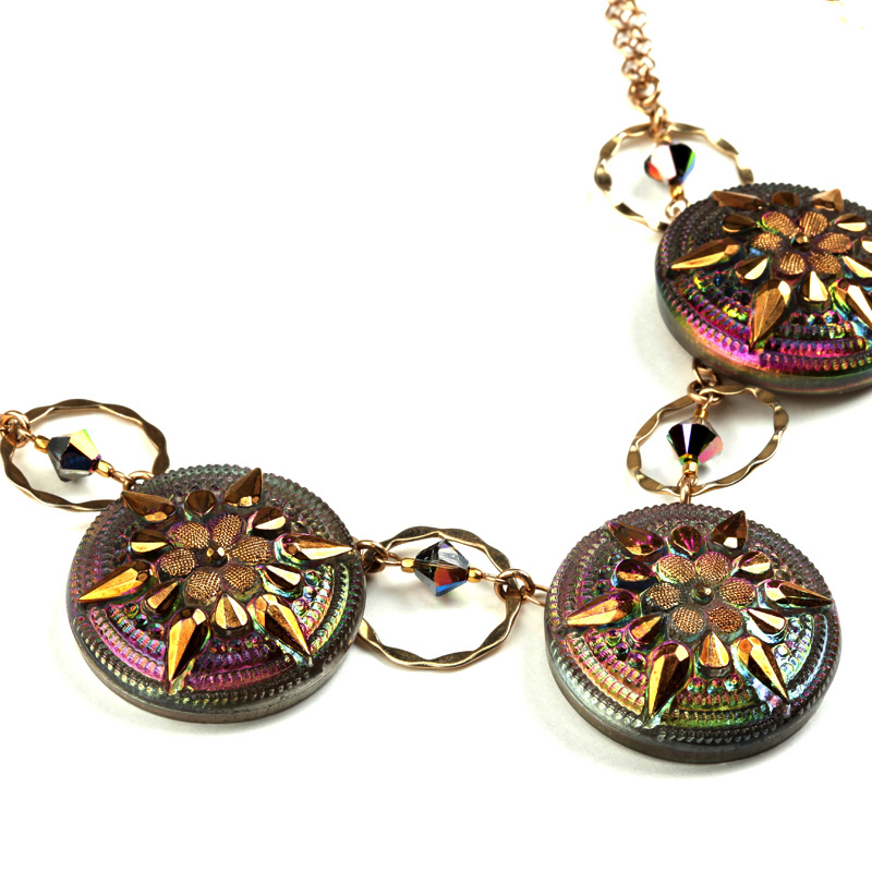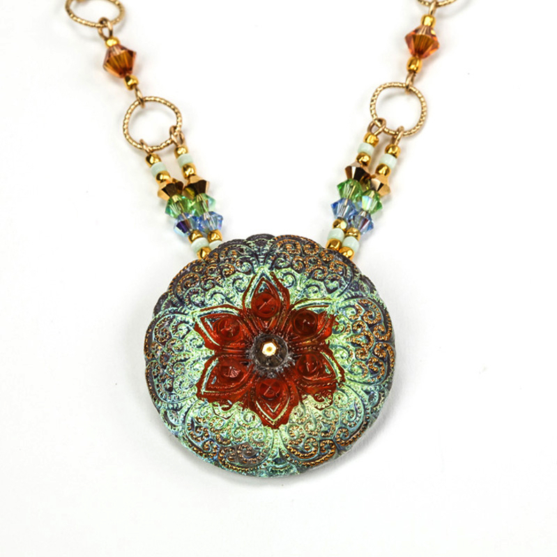 For 15 years, Cynthia has been able to source her buttons from producers whose pressing molds and secret color formulas date back 200 years or more, and she likes how this enhances the century-old hand-crafted glass beads from the same region. On top of that, the button and bead colors blend perfectly.