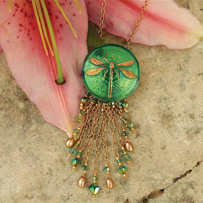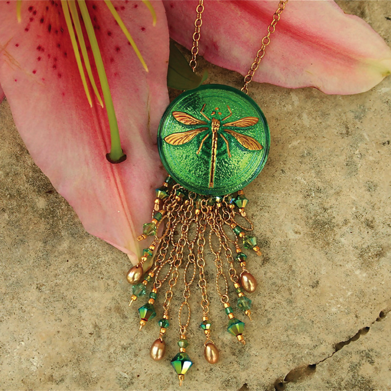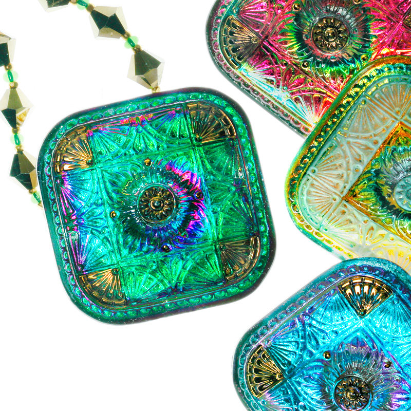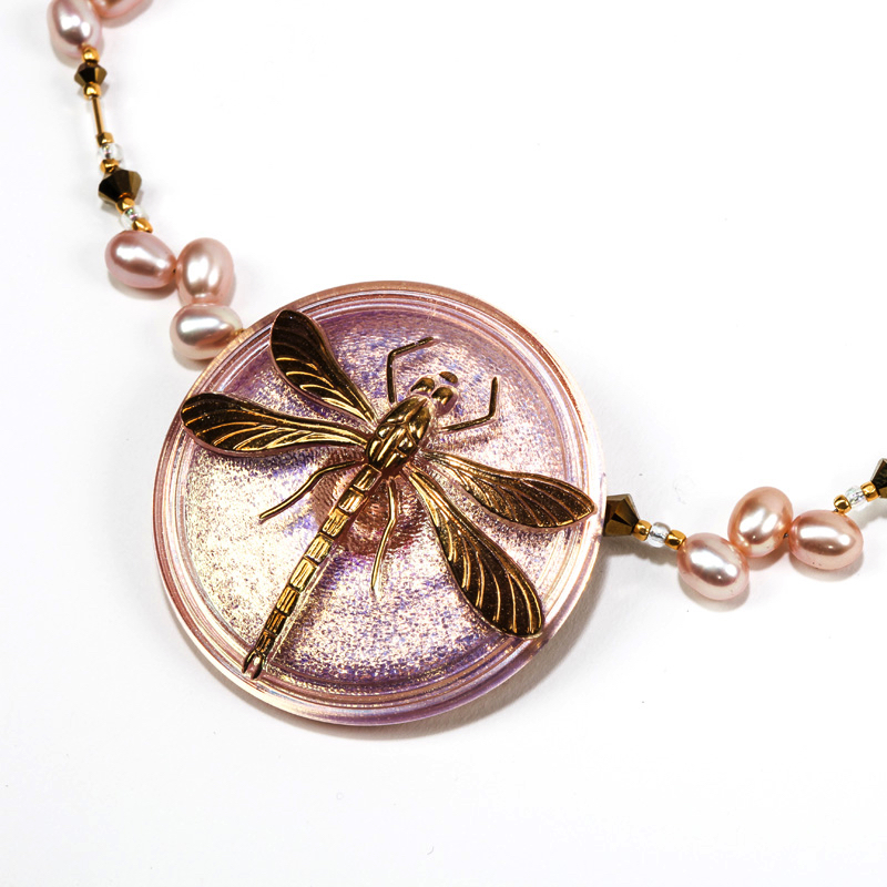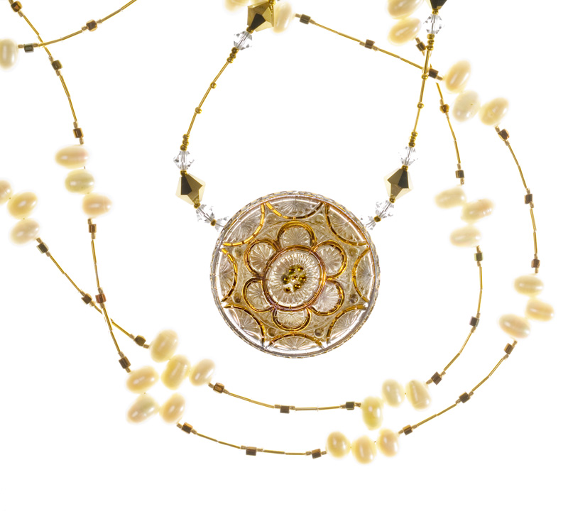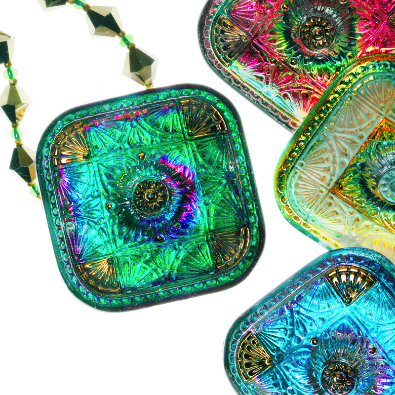 For 15 years, Cynthia has been able to source her buttons from producers whose pressing molds and secret color formulas date back 200 years or more, and she likes how this enhances the century-old hand-crafted glass beads from the same region. On top of that, the button and bead colors blend perfectly.