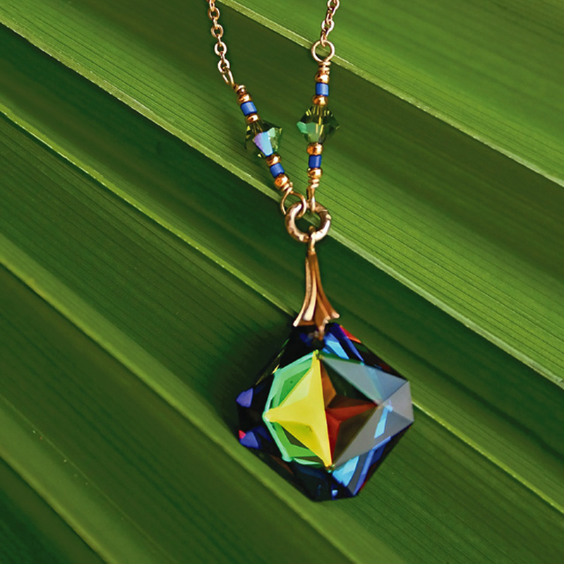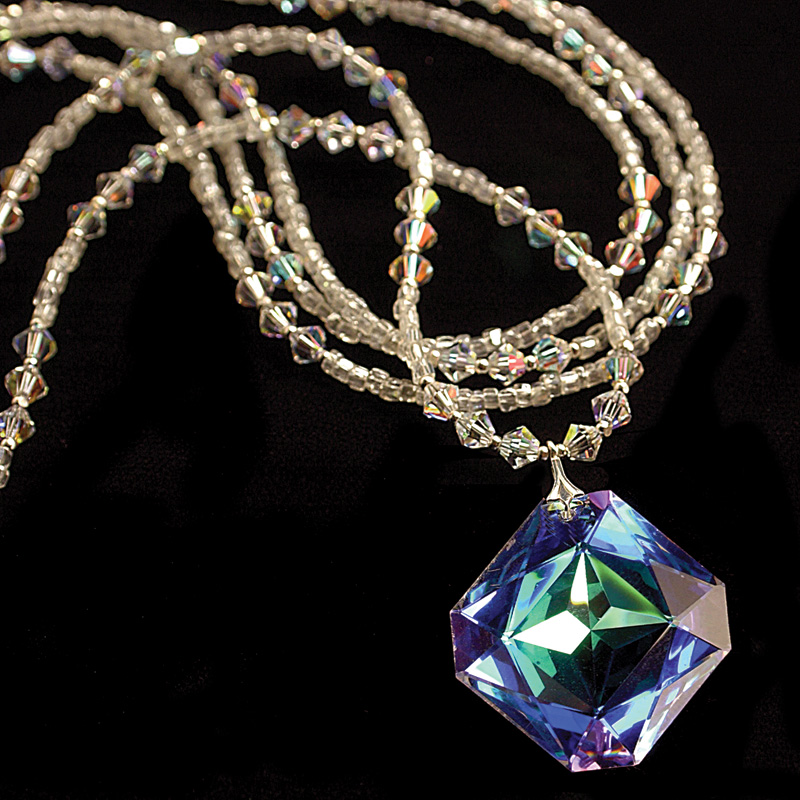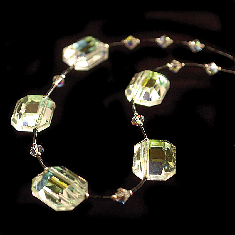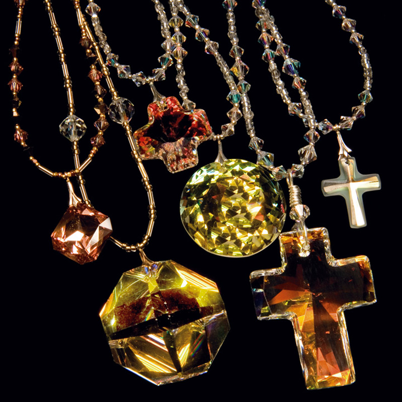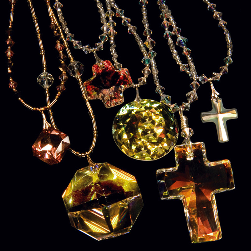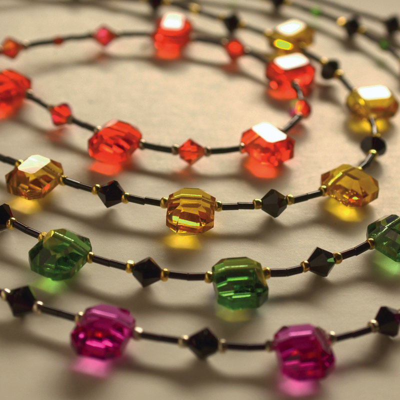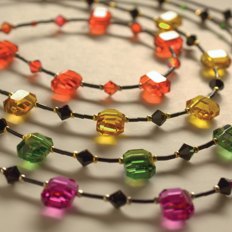 As she discovered the bead-making art and tradition of Central Europe’s Bohemian mountains, her playscape soon extended to Swarovski crystals, where precision cutting, clarity, and gem-like brilliance complement the lively irregularity of the hand-blown, hand-cut glass beads.