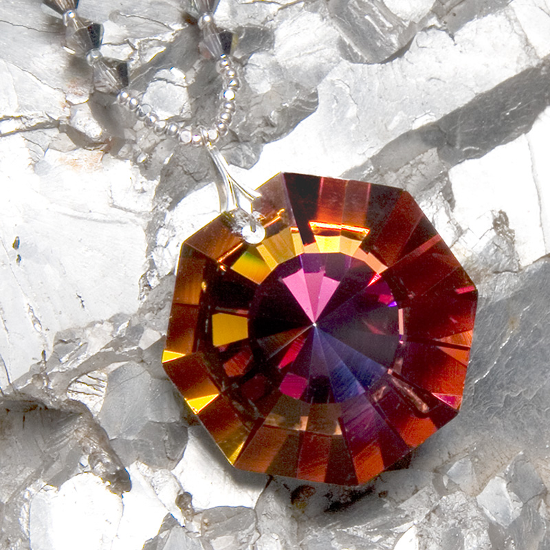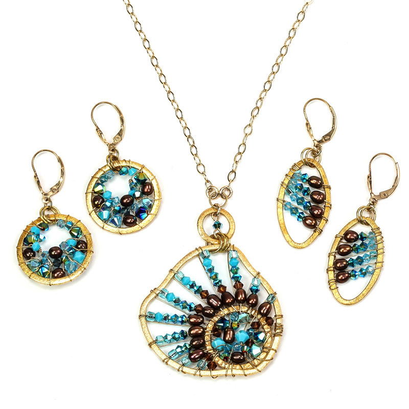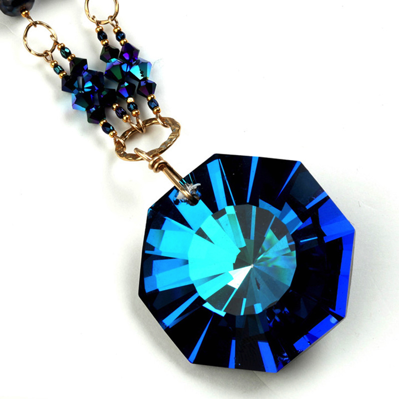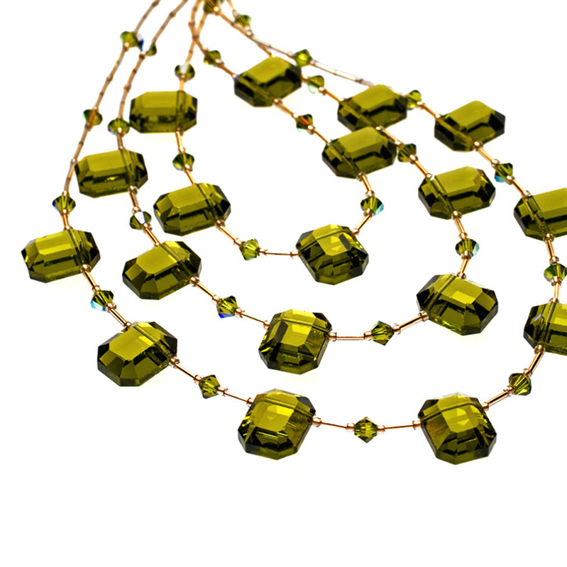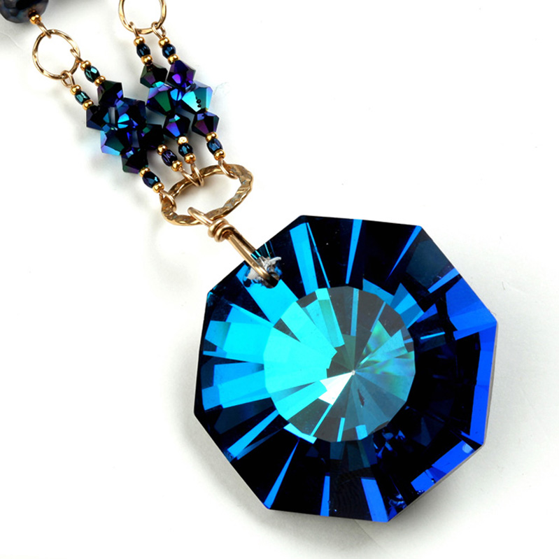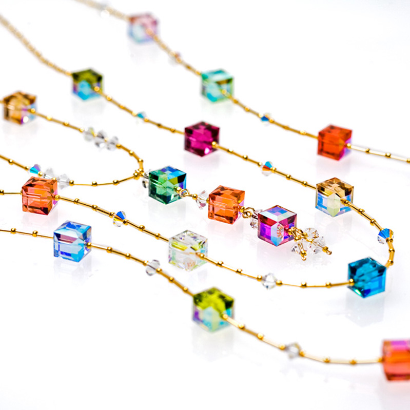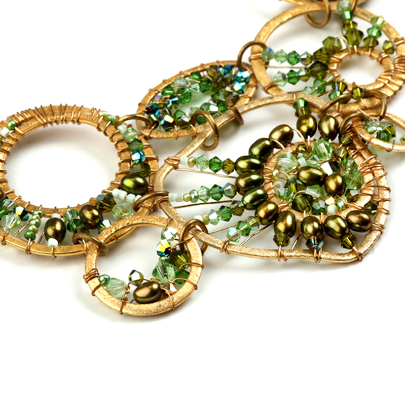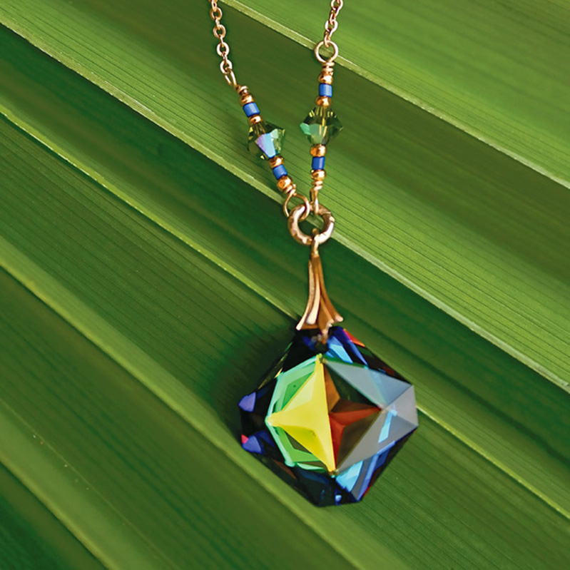 As she discovered the bead-making art and tradition of Central Europe’s Bohemian mountains, her playscape soon extended to Swarovski crystals, where precision cutting, clarity, and gem-like brilliance complement the lively irregularity of the hand-blown, hand-cut glass beads.